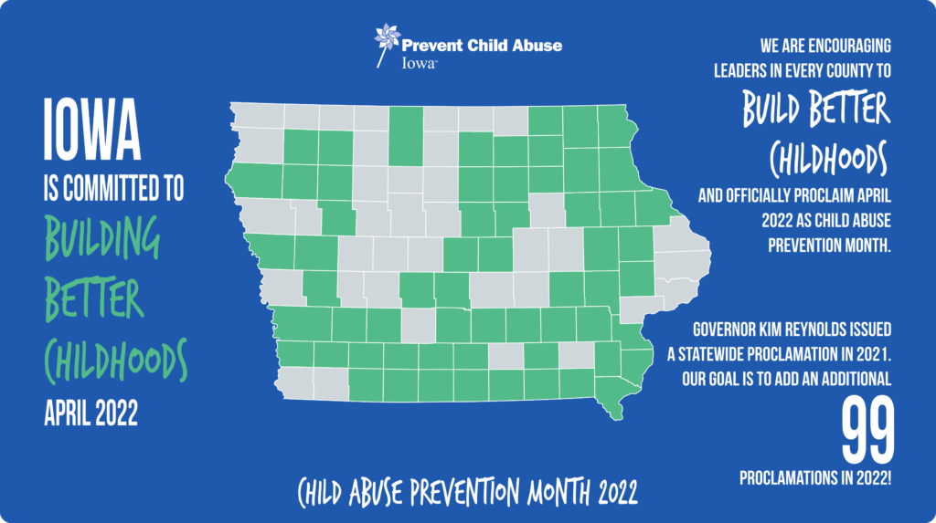 Prevent Child Abuse Iowa (PCA Iowa) has set an audacious goal for Child Abuse Prevention Month in April—a proclamation from county supervisors or local leaders in all 99 counties across the state. In 2021, PCA Iowa received a Child Abuse Prevention Month (CAP Month) proclamation from Governor Reynolds. This announcement proclaims that “every child can have a great childhood by making sure each family has the support and education they need in raising their children in safe, nurturing environments.” For 2022, the goal is 99 times bigger. To learn more about the project read our press release.