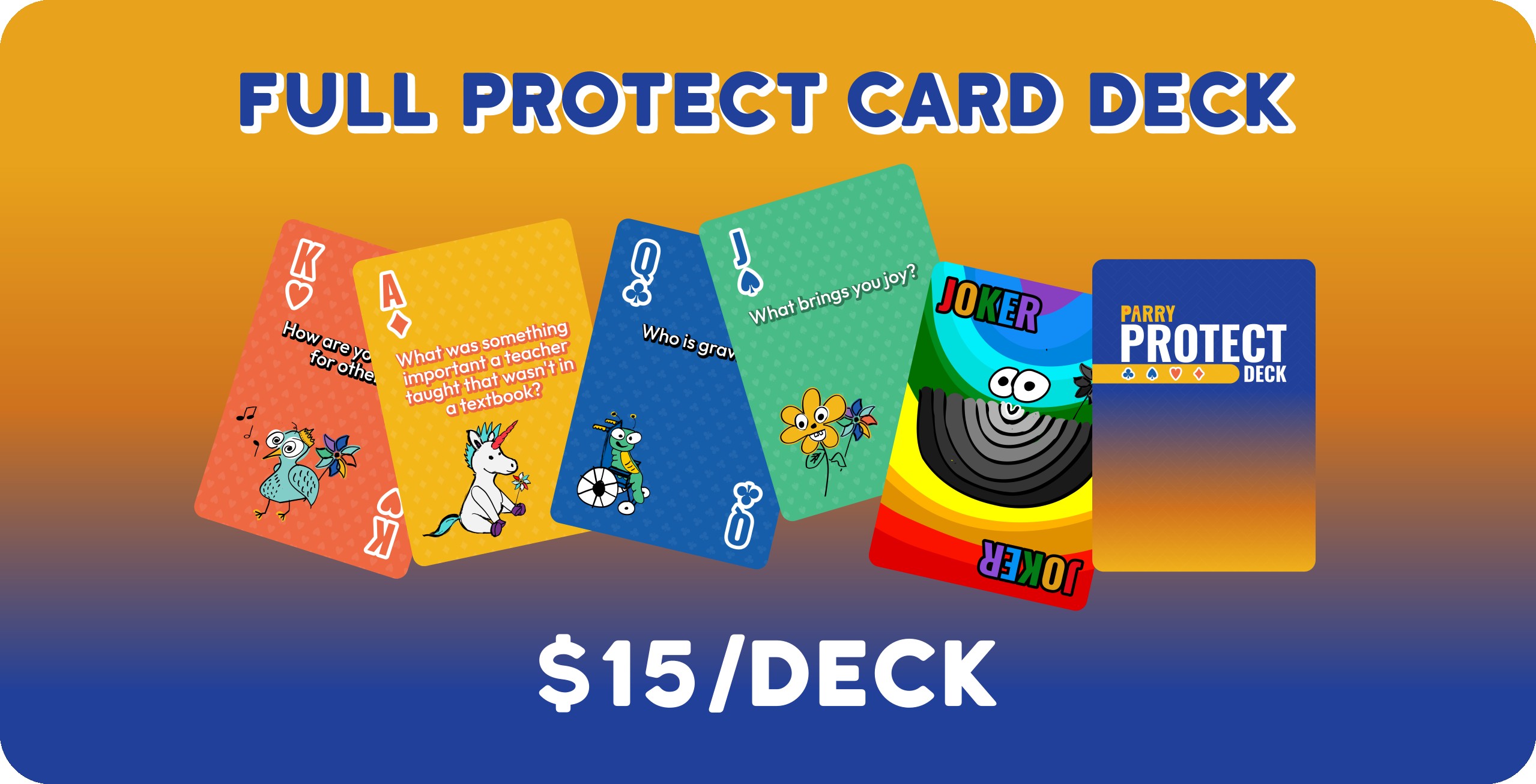 Meet our New Parry Protect Deck! A full deck of playable cards (with two jokers), each with an open-ended question to spark important and protective conversations for all ages.